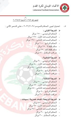 أعلن الإتحاد الكروي عن رفع الأجور التي يتقاضاها الحكام عن كل مباراة يقودونها في مختلف الدرجات بنسبة تصل لحوالي 50% تقريباً، على أن يبدأ العمل بتطبيق الزيادة الجديدة من تاريخ التعميم الأخير في السابع من الشهر الجاري ، ولحقت الزيادة الأكبر بالحكام الذين يقودون مباريات الدرجة الأولى ، إذ أن الحكم الرئيسي كان يتقاضى قبلاً مئة دولار عن كل مباراة وأصبح يتقاضى مئة وخمسون دولاراً امريكياً ، اي ان نسبة الزيادة هي 50% ، في حين أن الحكم المساعد كان يتقاضى 75 دولاراً ، وأصبح يتقاضى 125 دولاراً ، اي بزيادة حوالي 66% ، وبنفس النسبة لحقت الزيادة الحكم الرابع أيضاً والذي بات يحصل على مبلغ مئة دولار عن كل مباراة يشارك في قيادتها، بدلاً من 60 دولار سابقاً ، كما أن حكام الVAR لحقتهم الزودة بنسبة 50% ، في حين أن الزودة في بقية الدرجات كانت بنفس النسبة تقريباً ، لكنها ليست بذات القيمة خاصة في الدرجات الثالثة والرابعة والفئات العمرية والسيدات.