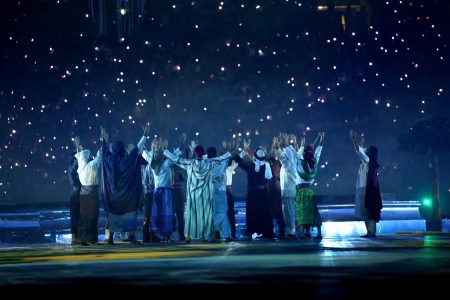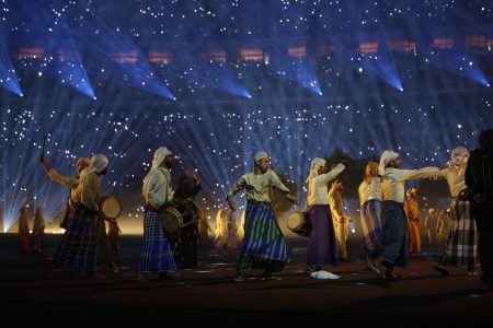 وشهد الحفل فقرات فنية وموسيقية تحكي إبداع وفنون وتراث العرب عبر الأجيال، وتم استخدام أحدث وسائل التكنولوجيا السمعية والبصرية في تناغم فريد أبهر عشرات الآلاف من الحاضرين والملايين خلف الشاشات.